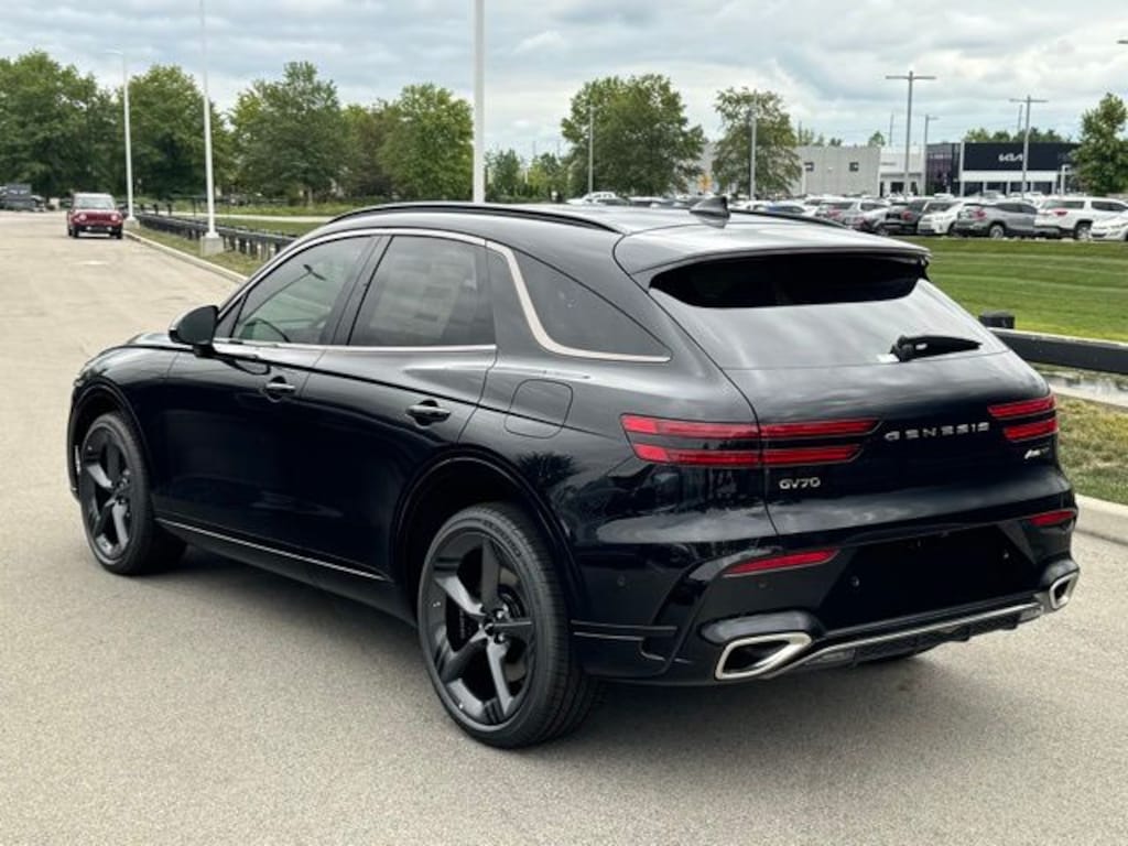 This GV70 is well equipped with Option Group 01, 16 Speakers, 4-Wheel Disc Brakes, ABS brakes, Adaptive suspension, Air Conditioning, Alloy wheels, AM/FM radio: SiriusXM, Android Auto & Apple CarPlay, Anti-whiplash front head restraints, Auto High-beam Headlights, Auto-dimming door mirrors, Auto-dimming Rear-View mirror, Automatic temperature control, Brake assist, Bumpers: body-color, Cargo Cover, Delay-off headlights, Driver door bin, Driver vanity mirror, Dual front impact airbags, Dual front side impact airbags, Electronic Stability Control, Emergency communication system: Genesis Connected Services, Exterior Parking Camera Rear, First Aid Kit, Four wheel independent suspension, Front anti-roll bar, Front Bucket Seats, Front Center Armrest w/Storage, Front dual zone A/C, Front reading lights, Fully automatic headlights, Garage door transmitter: HomeLink, Heads-Up Display, Heated and Ventilated Front Bucket Seats, Heated door mirrors, Heated front seats, Heated rear seats, Heated steering wheel, Illuminated entry, Knee airbag, Leather steering wheel, Low tire pressure warning, Memory seat, Nappa Leather Seating Surfaces, Navigation System, NFC Key Card, Occupant sensing airbag, Outside temperature display, Overhead airbag, Overhead console, Panic alarm, Passenger door bin, Passenger vanity mirror, Power door mirrors, Power driver seat, Power Liftgate, Power moonroof, Power passenger seat, Power steering, Power windows, Radio: 14.5" Navigation System with AM/FM/HD, Rain sensing wipers, Rear air conditioning, Rear anti-roll bar, Rear reading lights, Rear seat center armrest, Rear window defroster, Rear window wiper, Remote keyless entry, Roof Rack Cross Bars, Security system, Speed control, Speed-sensing steering, Speed-Sensitive Wipers, Split folding rear seat, Spoiler, Steering wheel memory, Steering wheel mounted audio controls, Tachometer, Telescoping steering wheel, Tilt steering wheel, Traction control, Trip computer, Turn signal indicator mirrors, Up Seatback Cargo Mat, Variably intermittent wipers, Ventilated front seats, and Wheels: 21" Dark Sputtering Alloy.