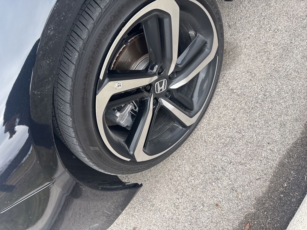 This Accord is well equipped with 4-Wheel Disc Brakes, 8 Speakers, ABS brakes, Adaptive Cruise Control: Adaptive Cruise Control (ACC) with Low-Speed Follow, Air Conditioning, Alloy wheels, AM/FM radio, Apple CarPlay/Android Auto, Auto High-beam Headlights, Automatic temperature control, Brake assist, Bumpers: body-color, Delay-off headlights, Driver door bin, Driver vanity mirror, Dual front impact airbags, Dual front side impact airbags, Electronic Stability Control, Emergency communication system: HondaLink, Exterior Parking Camera Rear, Fabric w/Synthetic Leather Seat Trim, Forward collision: Collision Mitigation Braking System (CMBS) + FCW mitigation, Four wheel independent suspension, Front anti-roll bar, Front Bucket Seats, Front Center Armrest, Front dual zone A/C, Front fog lights, Front reading lights, Fully automatic headlights, Illuminated entry, Knee airbag, Lane Departure Warning System, Leather Shift Knob, Leather steering wheel, Low tire pressure warning, Occupant sensing airbag, Outside temperature display, Overhead airbag, Overhead console, Panic alarm, Passenger door bin, Passenger vanity mirror, Power door mirrors, Power driver seat, Power steering, Power windows, Radio data system, Radio: 180-Watt AM/FM Audio System, Rear anti-roll bar, Rear seat center armrest, Rear window defroster, Remote keyless entry, Security system, Speed control, Speed-sensing steering, Speed-Sensitive Wipers, Split folding rear seat, Spoiler, Steering wheel mounted audio controls, Tachometer, Telescoping steering wheel, Tilt steering wheel, Traction control, Trip computer, Variably intermittent wipers, and Wheels: 19" Machine-Finished Alloy w/Black Inserts.